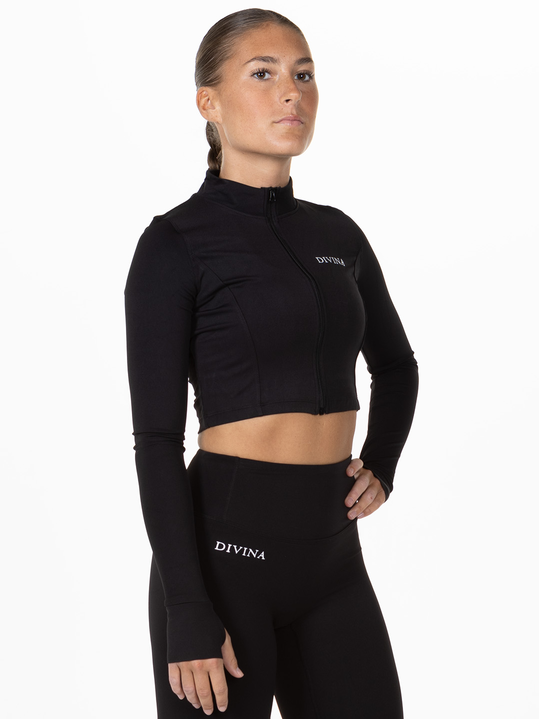 Jackan är av cropped modell och den åtsittande passformen ger en följsam och snygg look. Materialet andas och avvisar fukt, vilket hjälper att hålla dig torr och bekväm, även under intensiva träningspass.