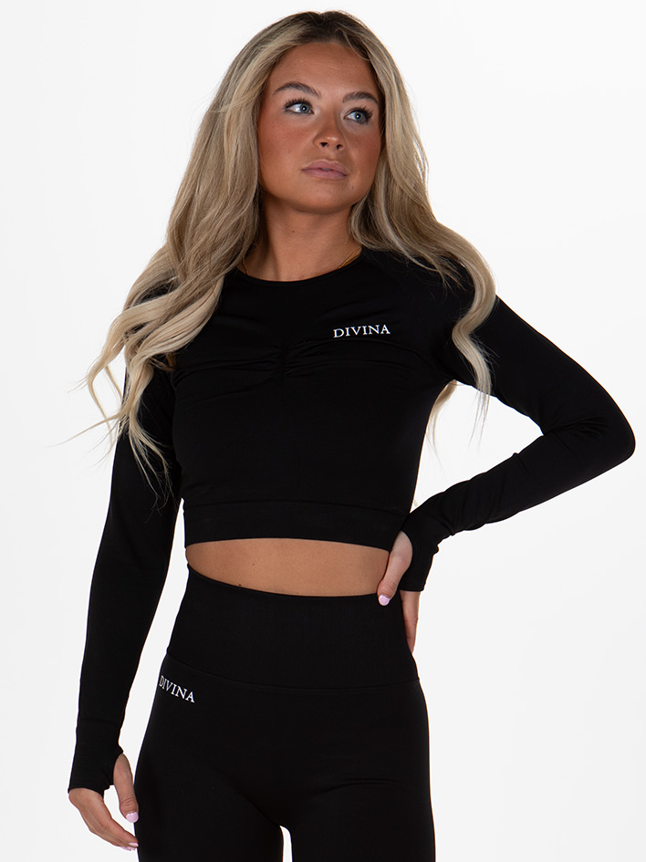 Experience our fantastic crop top Ohana. This versatile top is workout-friendly and stylish with a sleek scrunch seam at the front that creates an eye-catching visual impact. In addition, it is designed with comfortable thumb holes on both sleeves, giving you the freedom to move with ease.